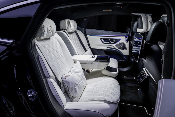 Mercedes-Benz’in EQS’in arka konforunu artırmış olması, bir süredir standart olan Arka Koltuk Paketi için de geçerli. Sırtlığın açısı bir düğmeye dokunarak 27-36 derece arasında ayarlanabiliyor. Koltuk kılıflarının katmanlı görünümü, bireysel kullanıma uygunluğunu vurguluyor. Sırtlıktaki beş milimetre daha fazla köpük ve yan desteklerden ayrılan kılıf daha yumuşak bir oturma deneyimi sağlıyor.